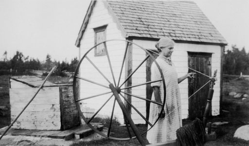 Mrs. Andrew Doane, Ingomar, Shelb. Co., with her walking wheel.. Walking wheels / Great wheel have a simple spindle assembly, which required an additional step to wind the thread on the spindle. Clara Dennis Nova Scotia Archives 1983-468 number 60