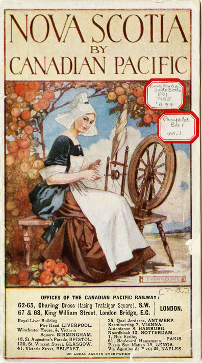 Illustrated Canadian Pacific advertisement with ”Evangeline” at a spinning wheel. Nova Scotia Archives Library: F91 N85 G94 number 1
