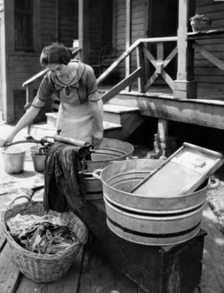 Invented in the 1840’s the washboard, some made entirely of wood, others of galvanized metal, was a major technological advancement. Although good soaps and basic equipment were helping to reduce the workload, the process of washing would still take hours of back breaking effort.